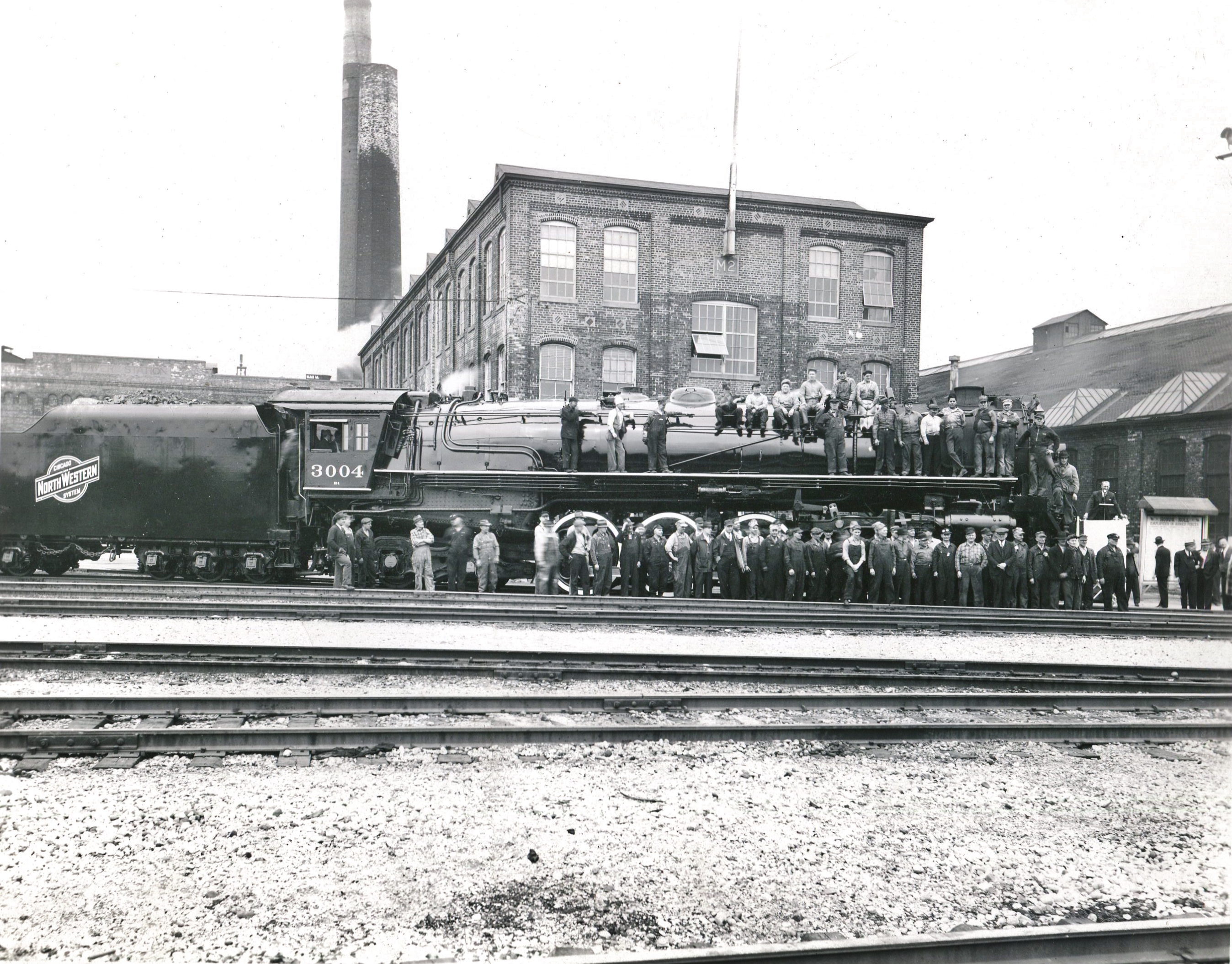 The setting the C&NW 40th Street Shops. Most likely a group photo following the rebuild of locomotive #3004