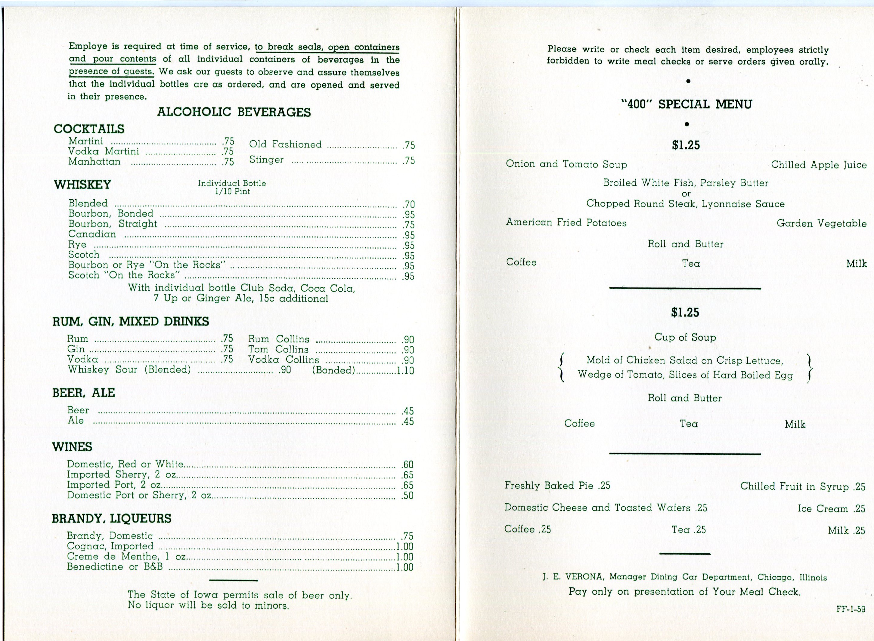 Lounge Car Beverage Menu from The Twin Cities 400 / Cover