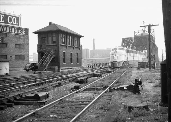 Train #401 approaching Milwaukee's Lakefront crossing Milwaukee River swing bridge with railroad tower on left. Date & photographer unknown