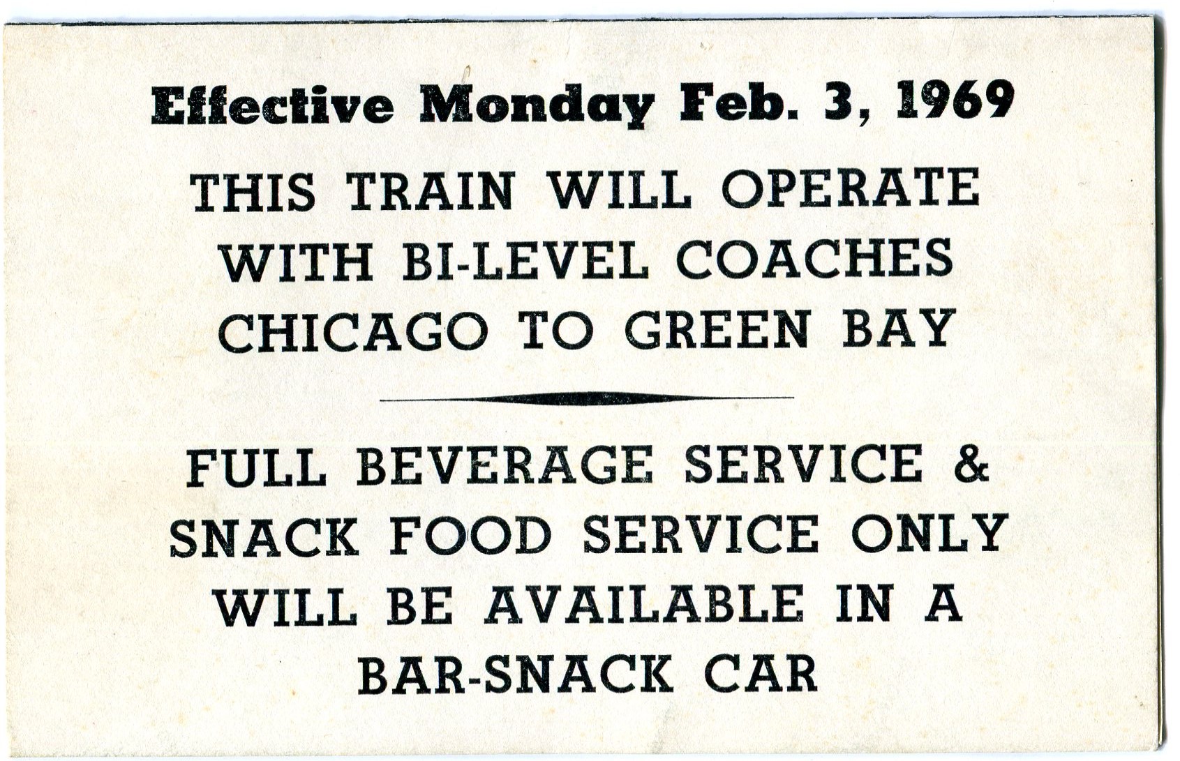 Table notices like this were placed on dining car tables advising customers that dining cars would be replaced by "Sip & Snack" cars. Intercity bilevel cars #600 and #903 were converted with microwaveovens and replaced the 48 seat diners on trains 153, 216, 214, 209. This operation was operated by contract with Albert Pick & Company. This spelled the end of the Chicago and Northwestern Dining Car & Commissary Department which ceased public operations on February, 2nd 1969.