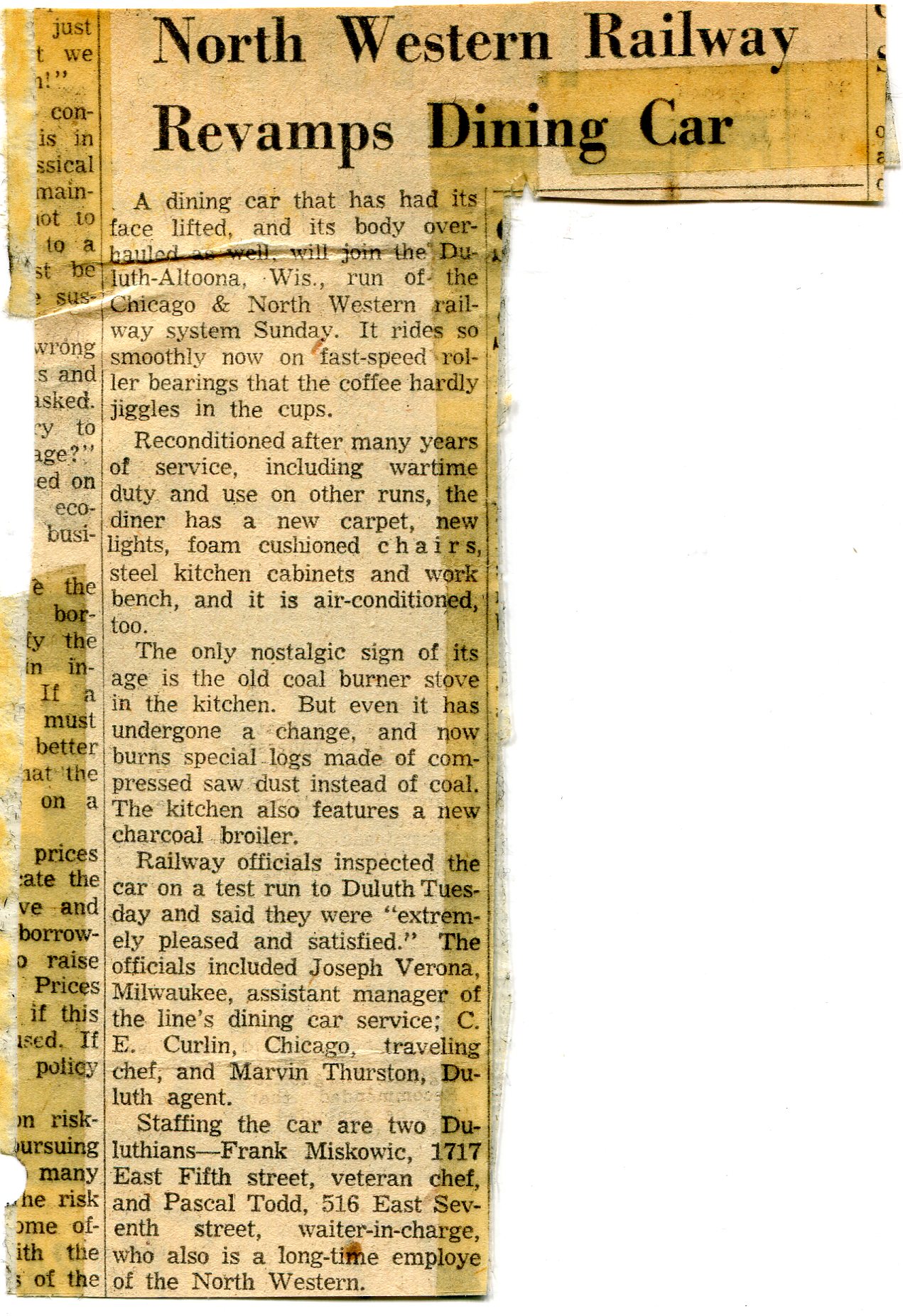Article on rebuilt dining car for operation between Duluth and Altoona, WI.